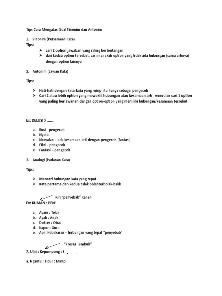 80 contoh soal cpns tes persamaan kata (sinonim), petunjuk tes persamaan kata (sinonim)pilihlah jawaban yang paling benar. Ditanyakan di soal tes sinonim. Sinonim=jamu mempunyai segudang khasiat.sinonim kata khasiat adalah. 500+ kumpulan kata antonim terbaru untuk taklukkan soal tiu cpns tpa utbk spmb stan 2021/2022. Latihan soal seleksi cpns tes intelegensi umum .